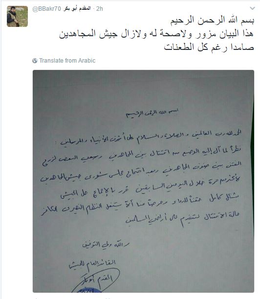 وكانت صفحات عدة تداولت بياناً مزوراً منسوباً إلى قائد جيش المجاهدين ينص على حل الفصيل درءاً للفتن بين صفوف المجاهدين وحقناً للدماء، فيما ذُيِّل البيان بختم وتوقيع مزورين.